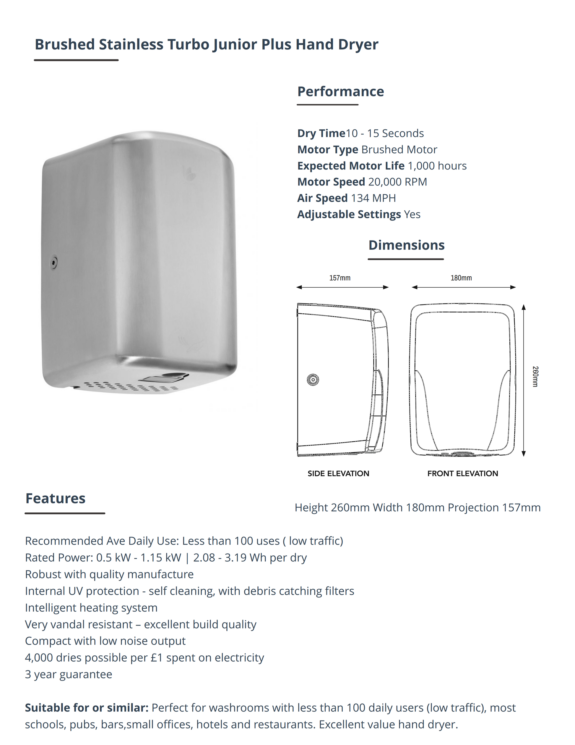 Brushed Stainless Turbo Junior Plus Hand Dryer