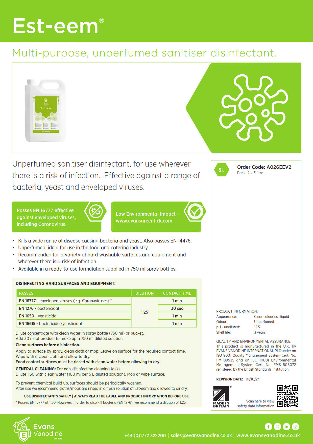 - Passes EN 16777 and EN 14476; effective against enveloped viruses, including Coronavirus.