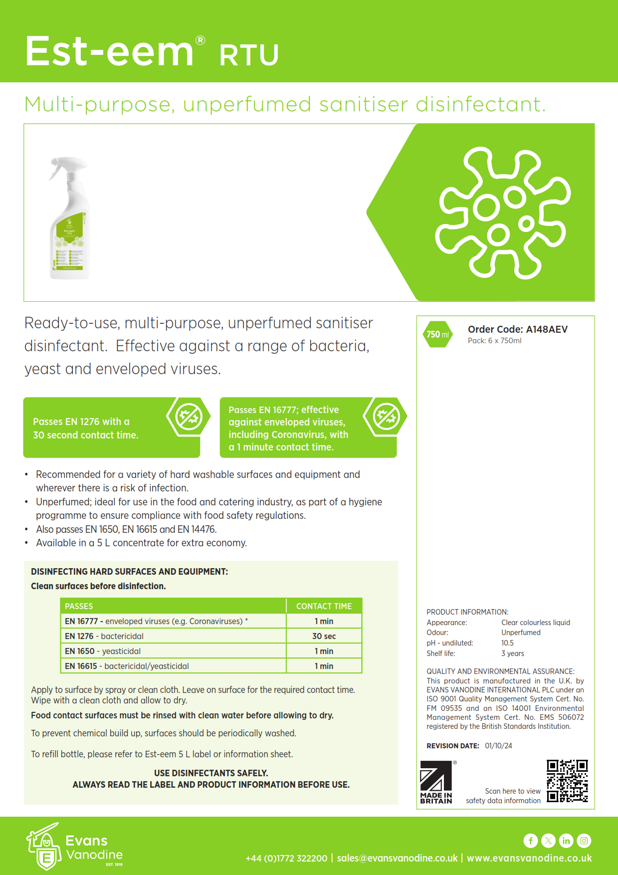 - Ready-to-use, multi-purpose sanitiser and terminal disinfectant