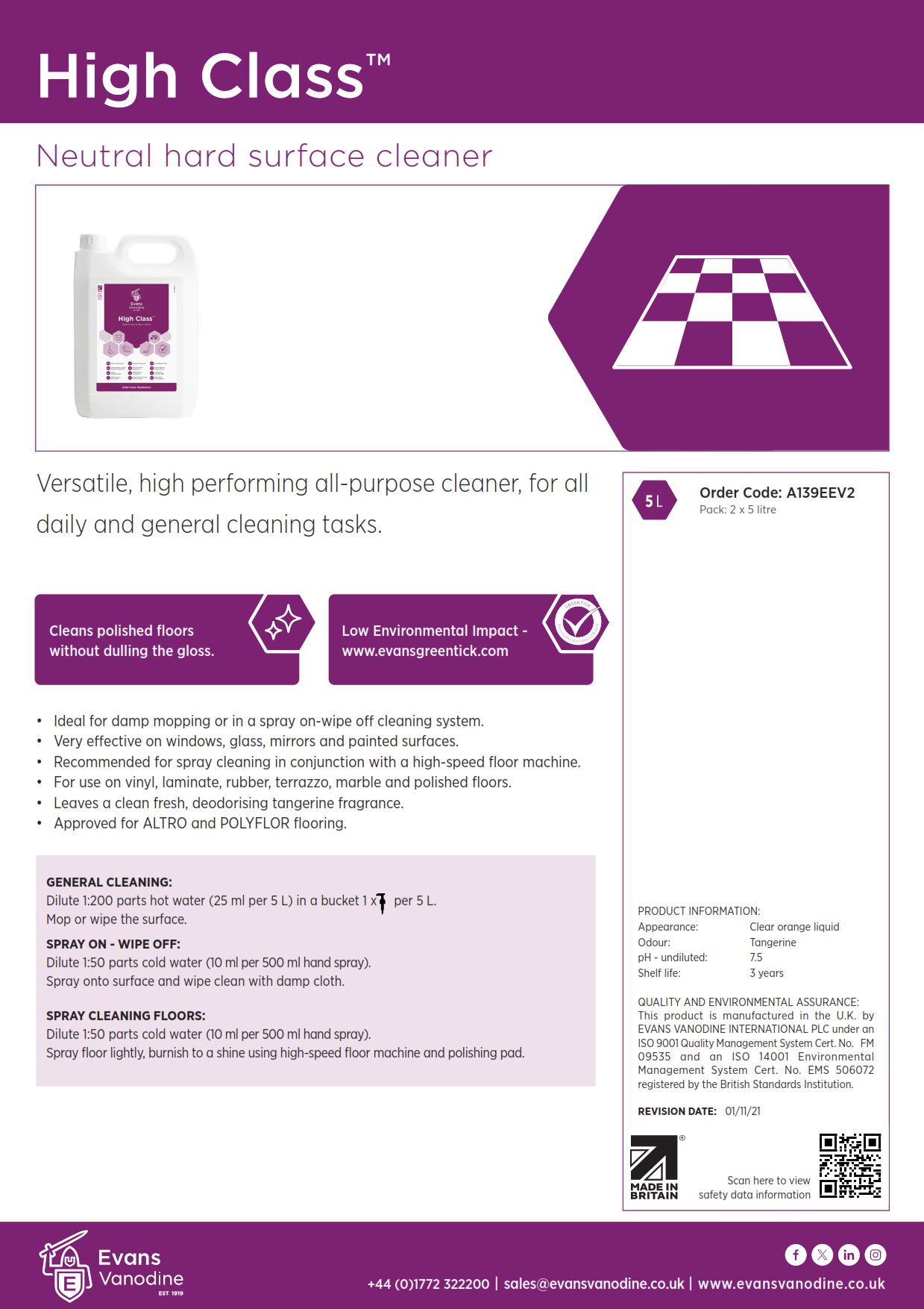 - Ideal for mopping, or spray on/wipe of cleaning