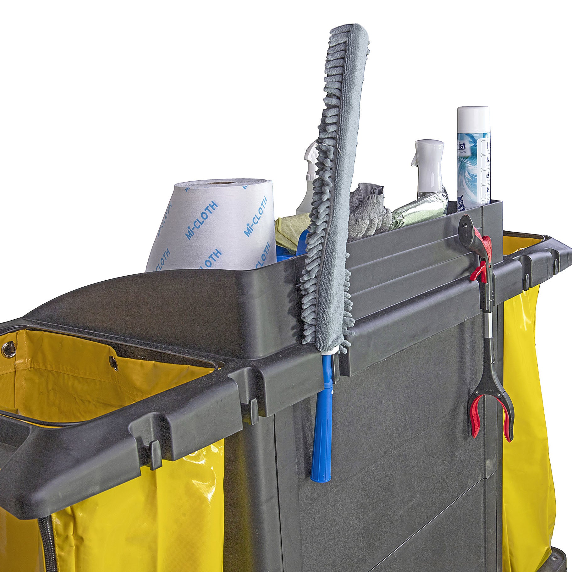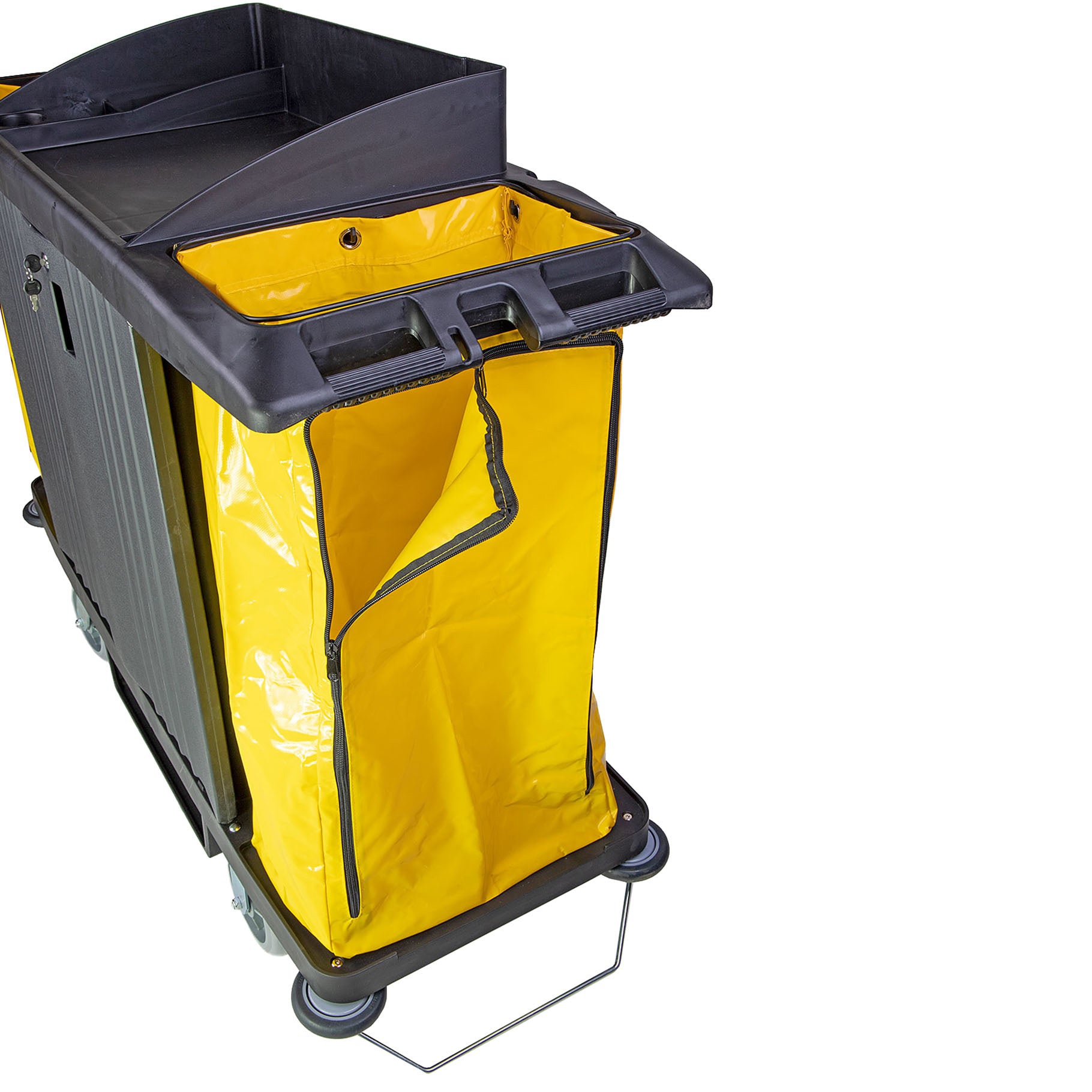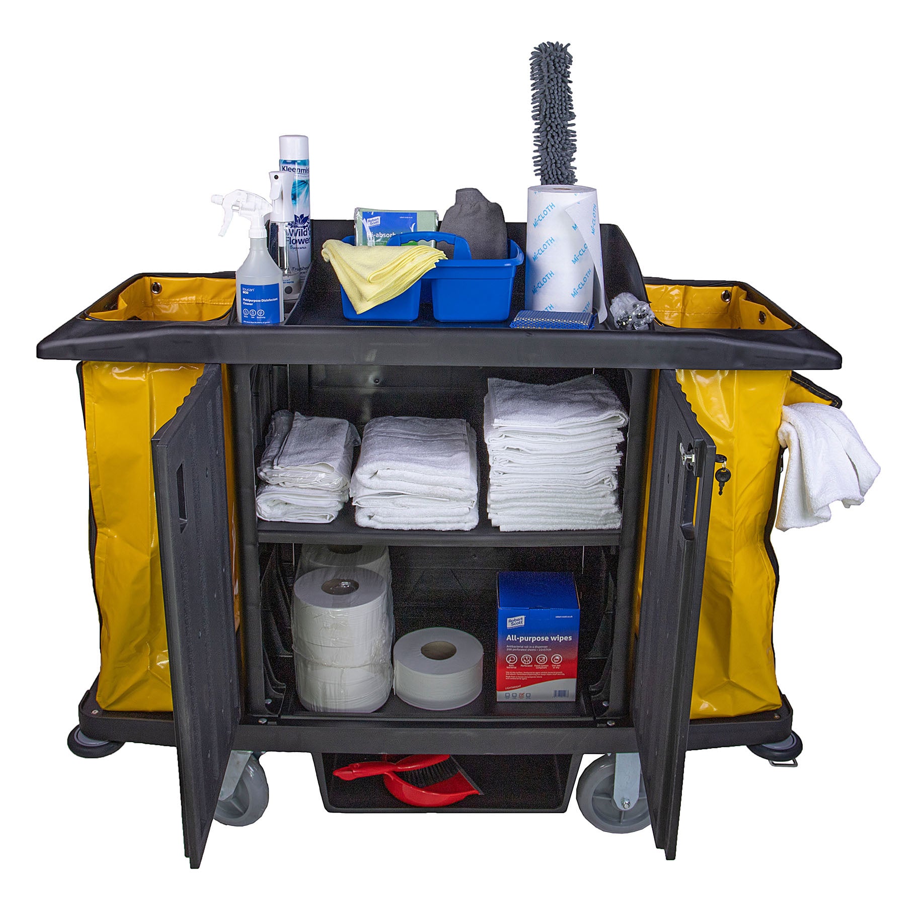 A commercial grade housekeeping trolley featuring a large storage cabinet with adjustable shelf and lockable doors to secure supplies when unattended.