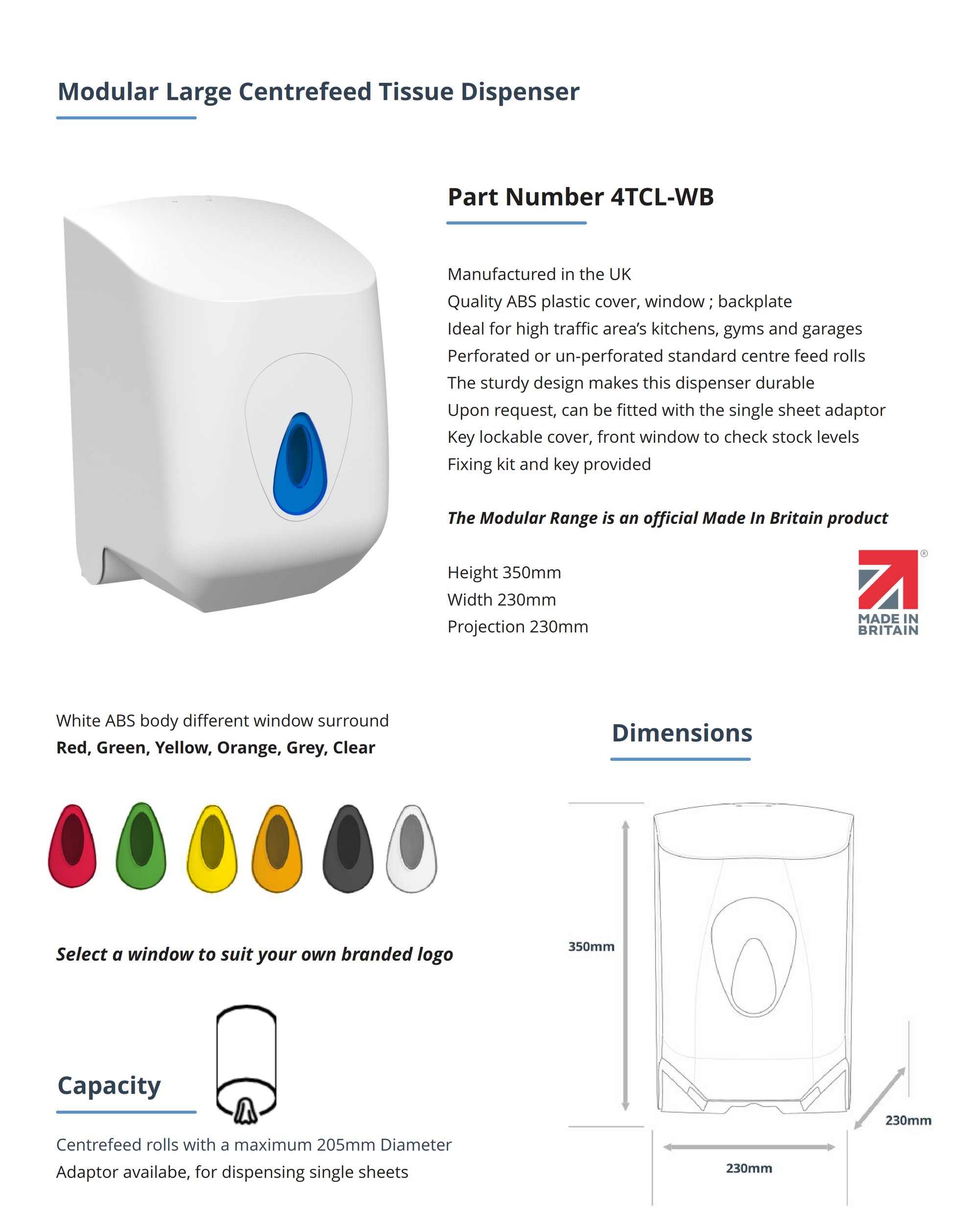 - Designed for standard centre feed rolls