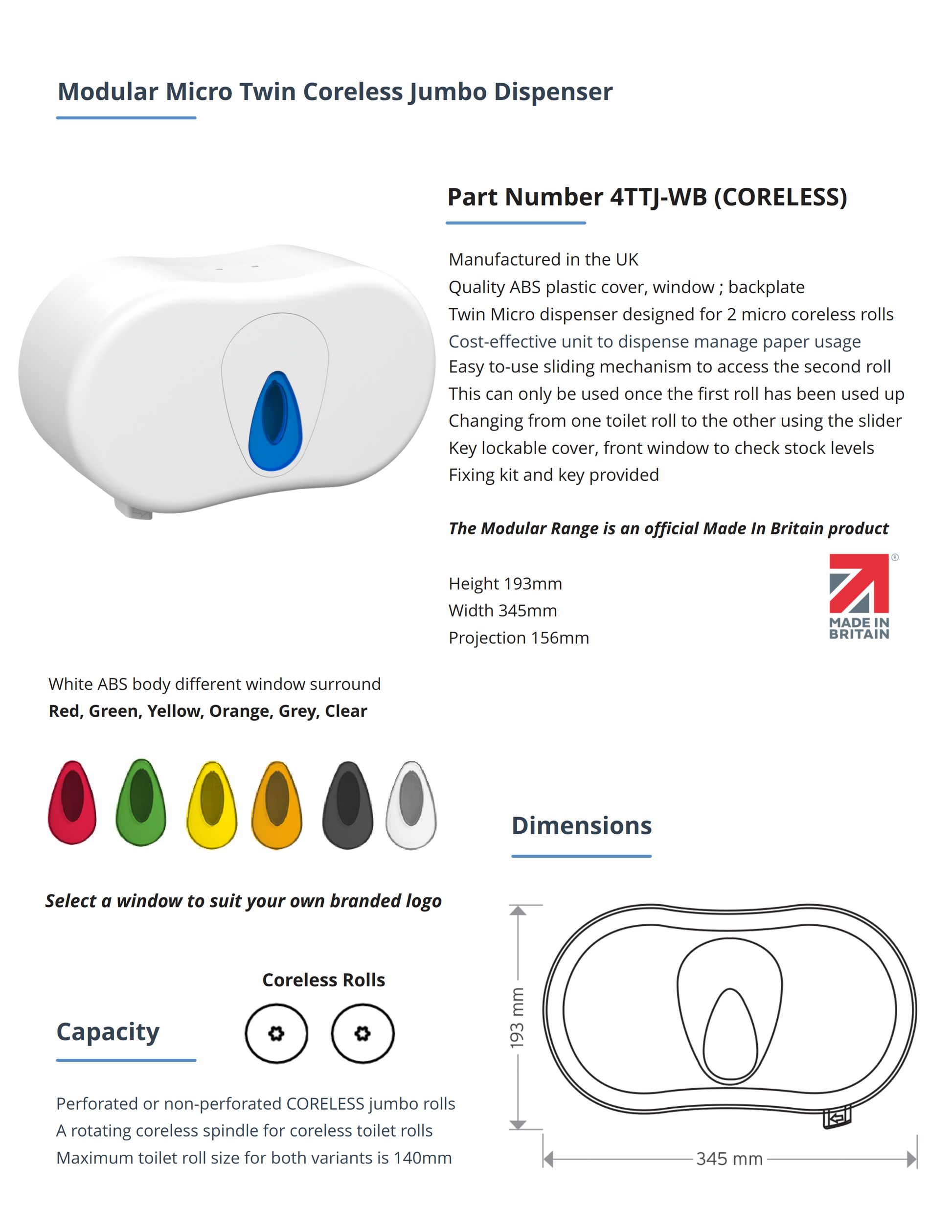 - Twin Micro dispenser designed for 2 micro cored rolls