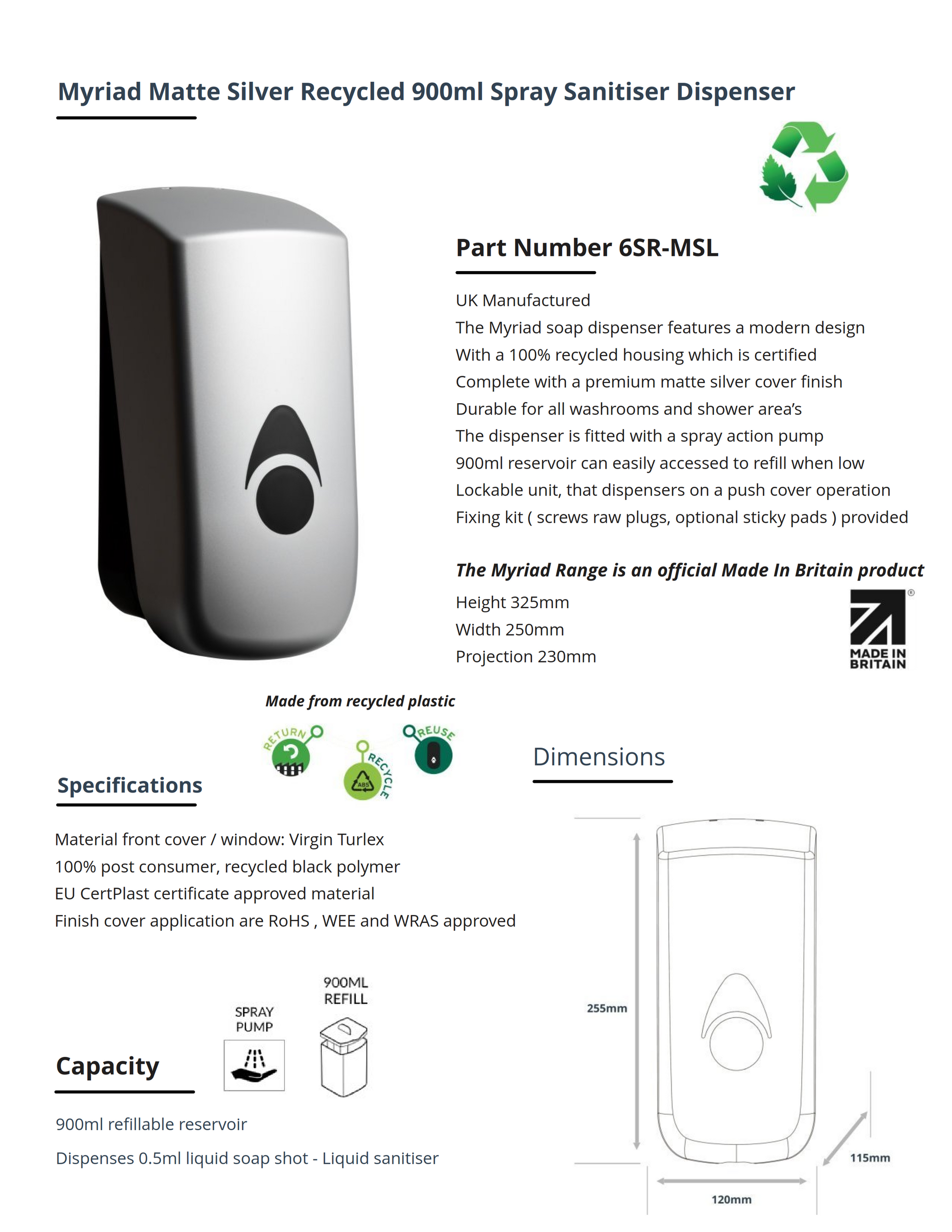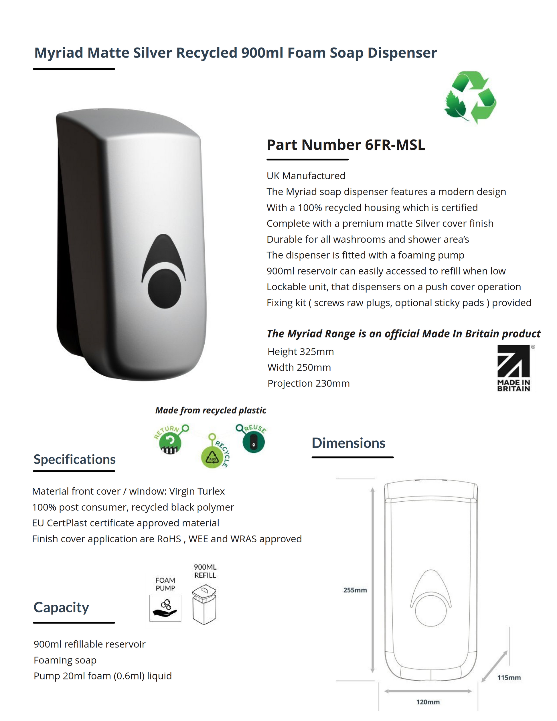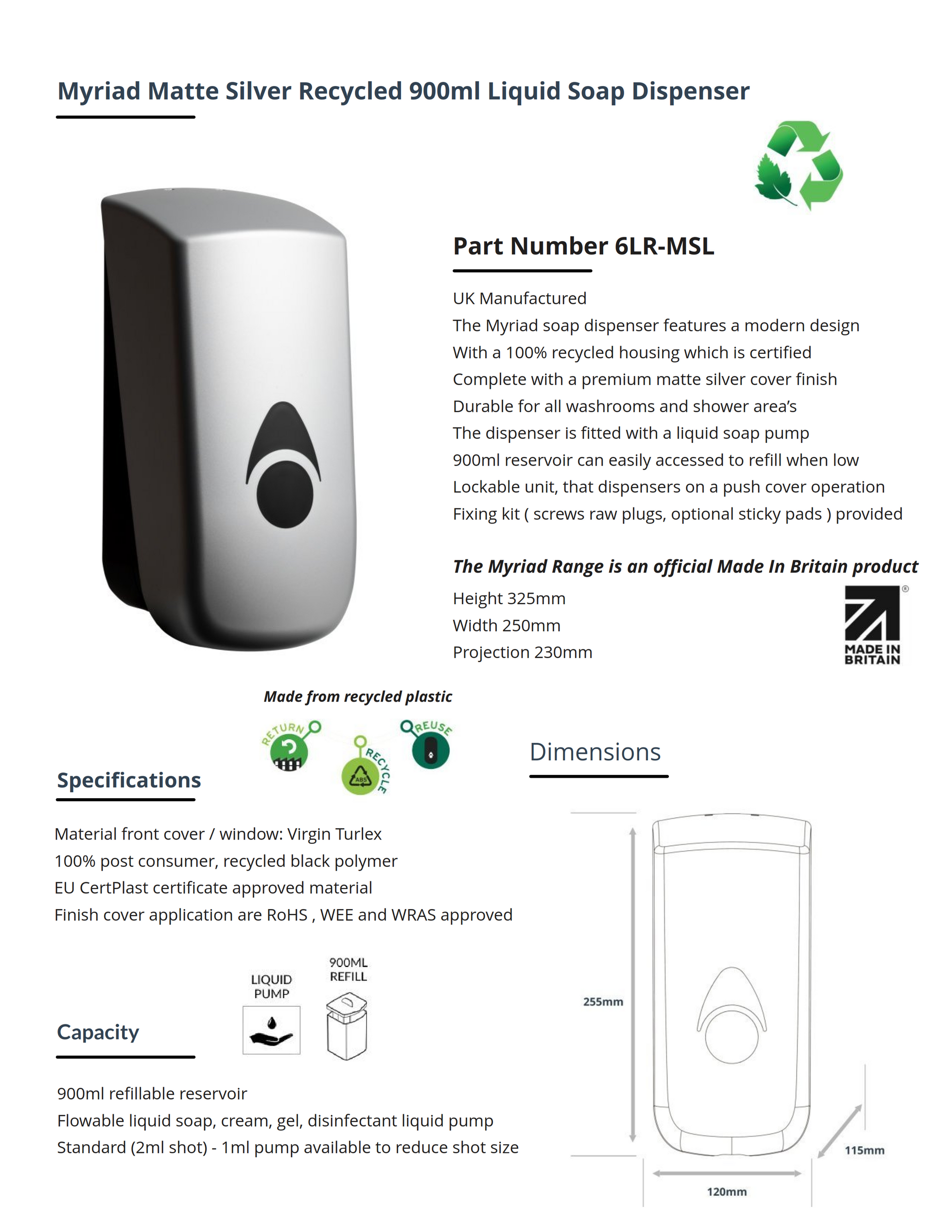 Myriad Matte Silver Recycled 900ml Soap Dispenser