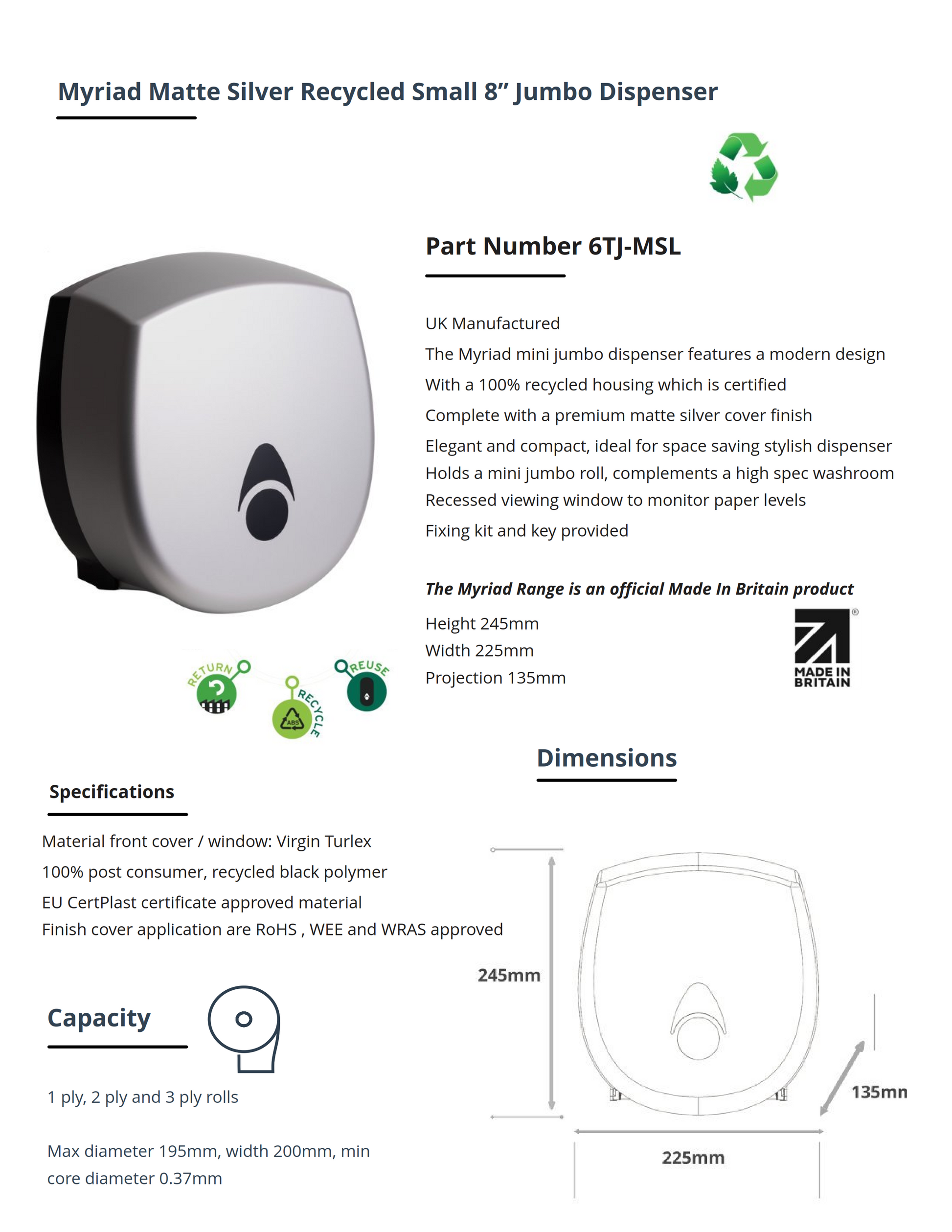 Myriad Matte Silver Recycled Small 8” Jumbo Dispenser
