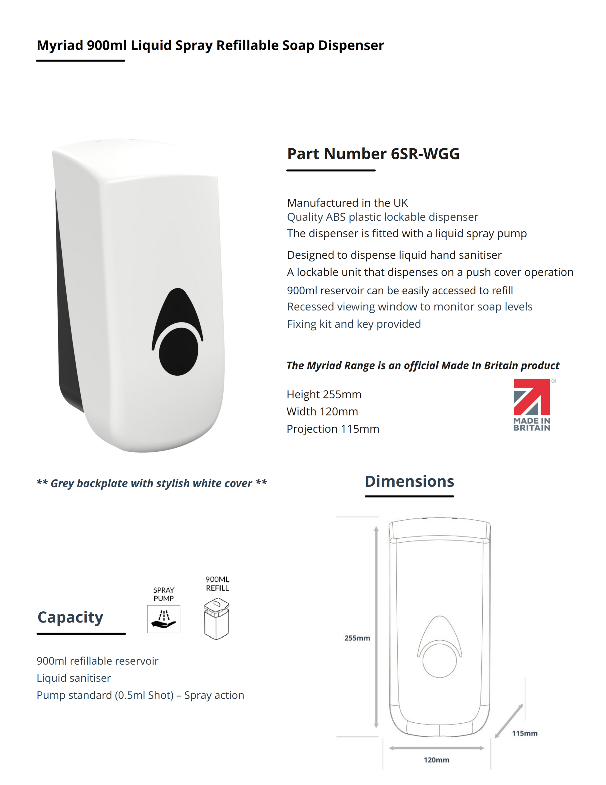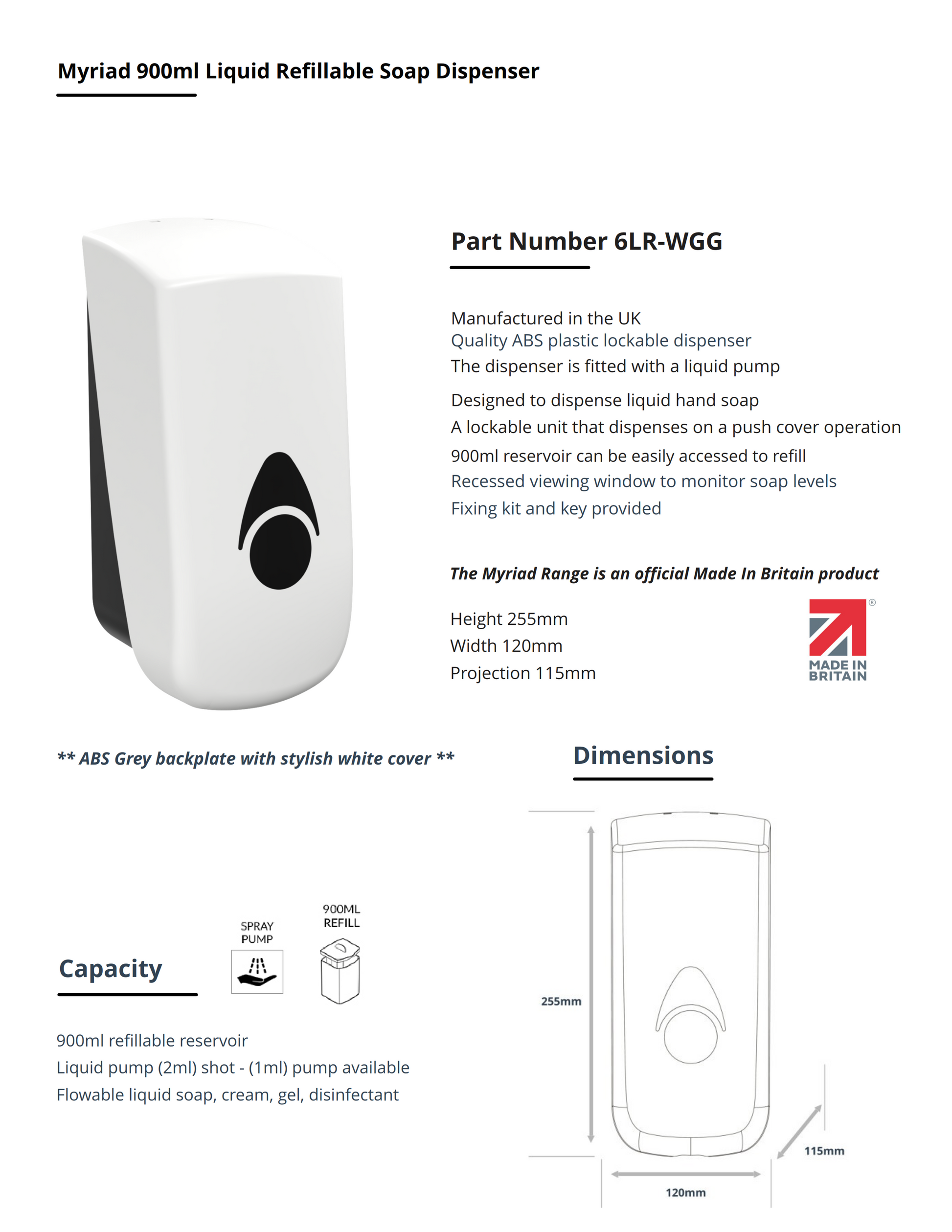 Myriad White / Grey 900ml Refillable Soap Dispenser