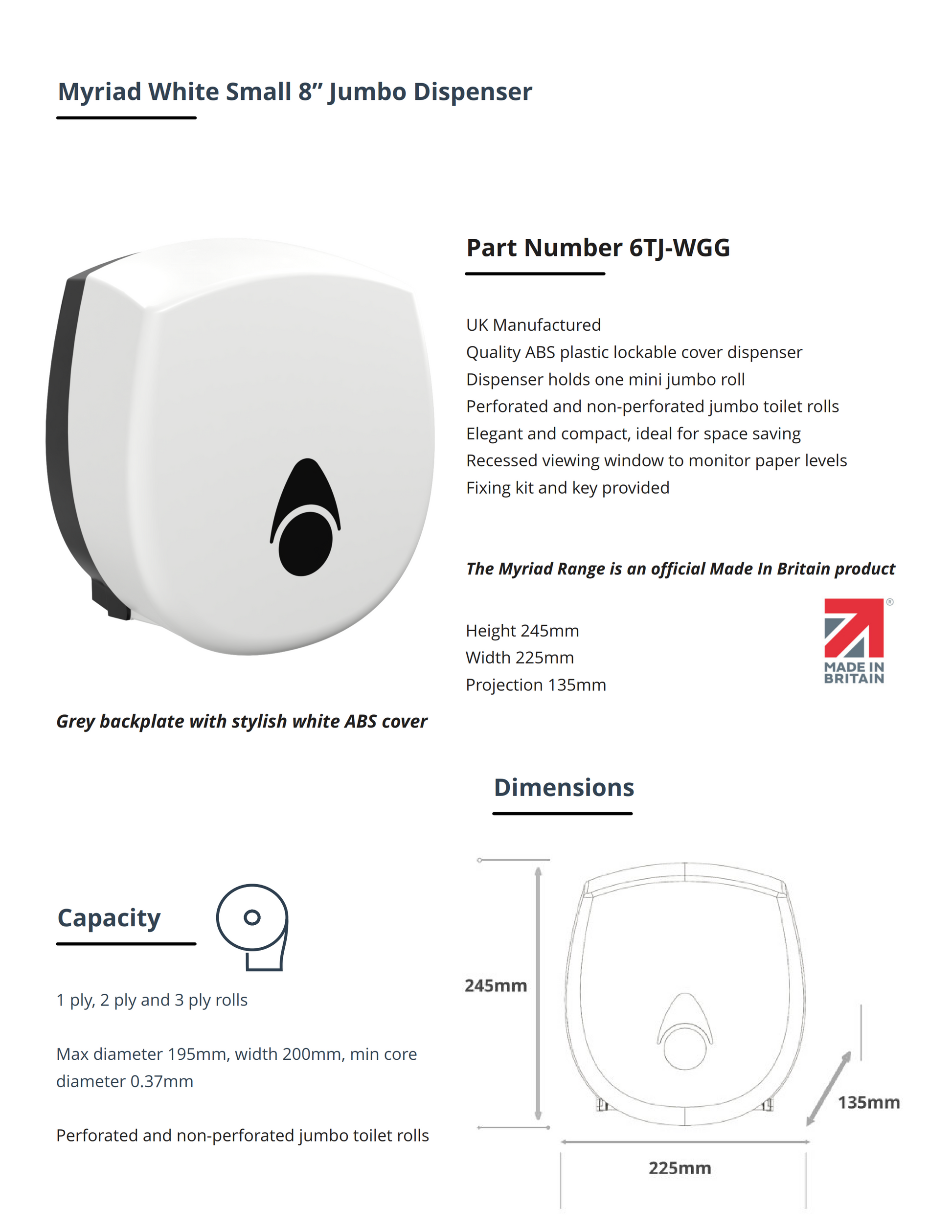 Myriad White Small 8” Jumbo Dispenser