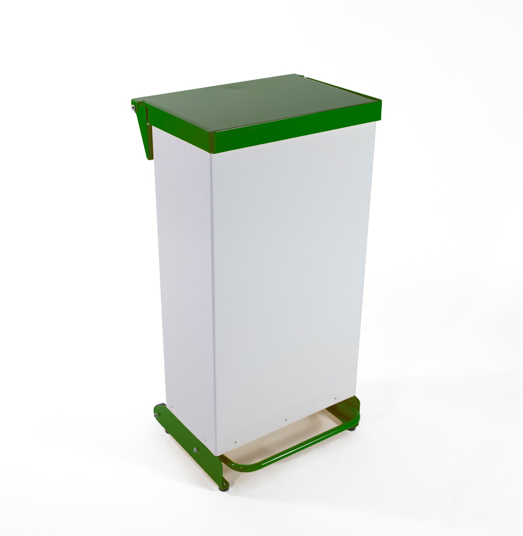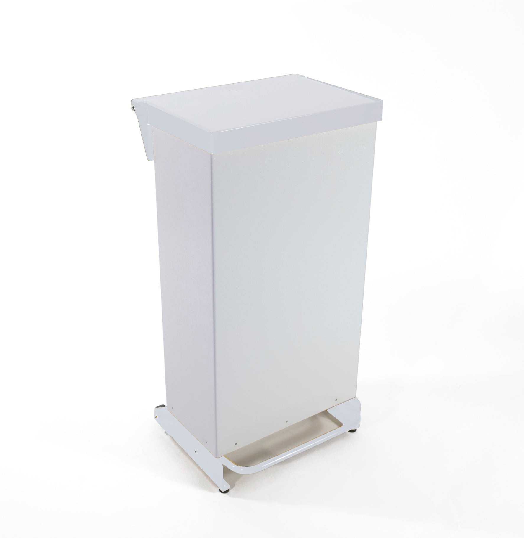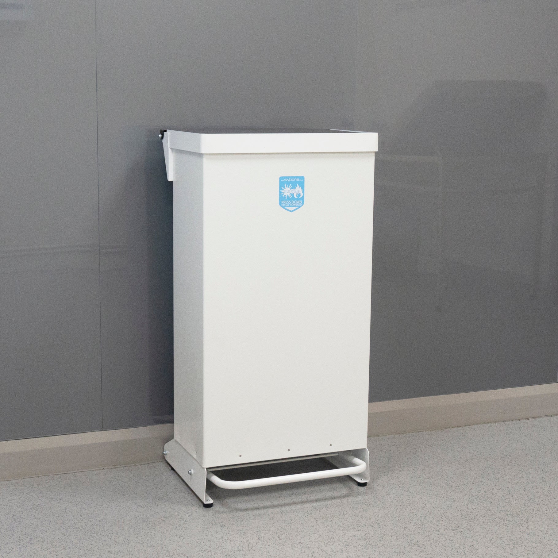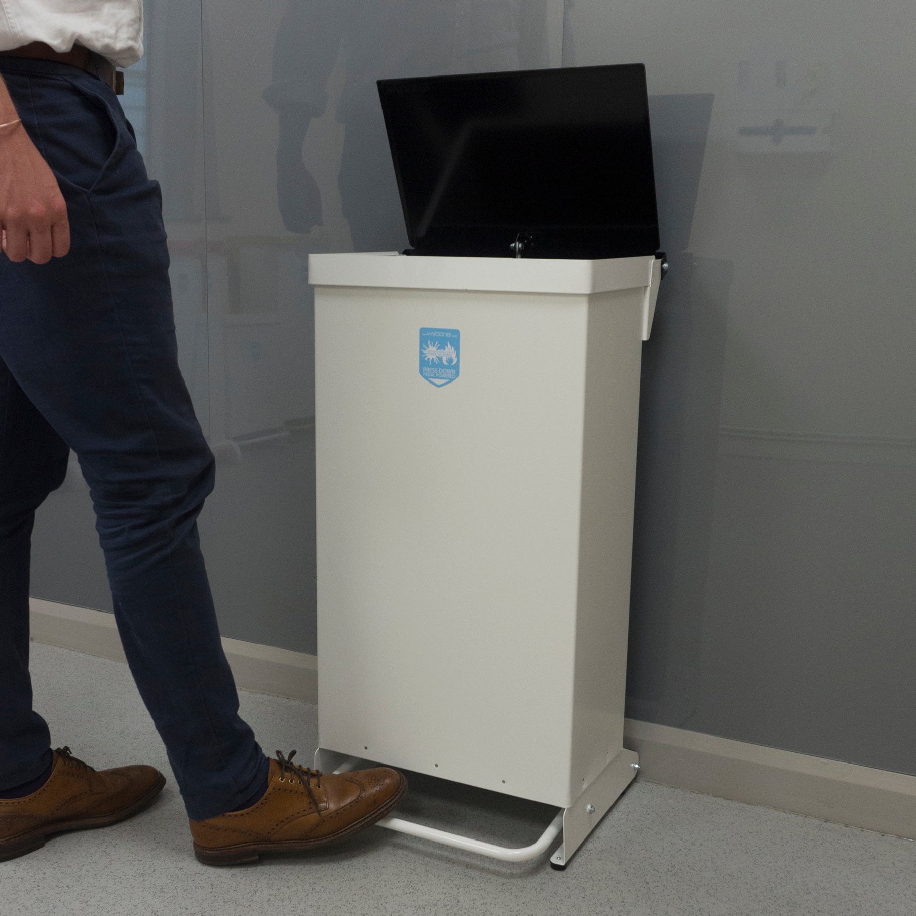 This bin is foot pedal operated. The user simply presses the foot pedal to lift the lid so that they can deposit their waste without any need to touch the lid. And as the lid sits flush within the frame, there’s no need to worry about users trying to lift the lid by hand.