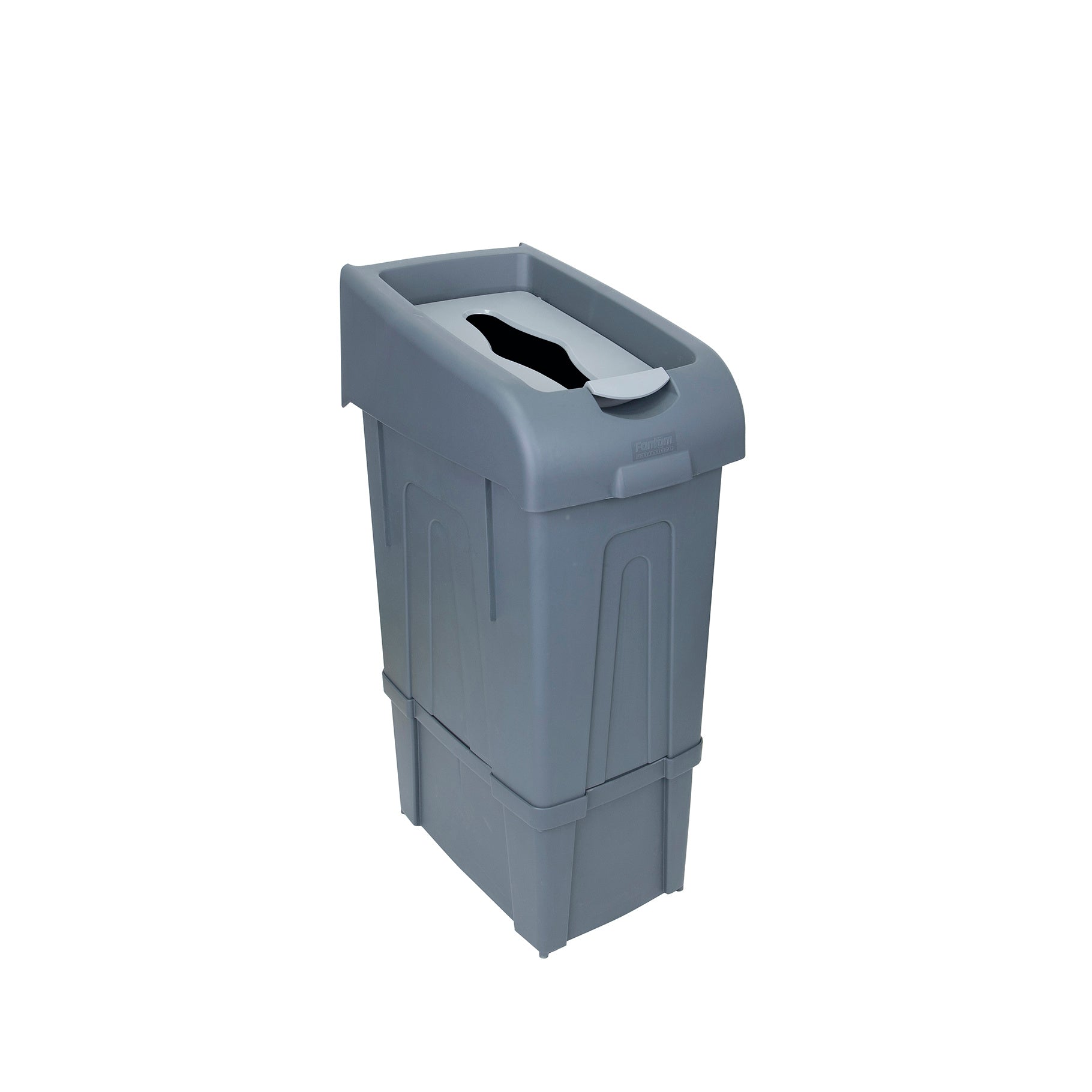 A modular recycling bin with lid and includes connectors to build your own multi-recycling stations. The design features apertures at the front of the bin to attach waste bags (bags not included), while the lid can be lifted for the disposal of larger items and removed for an open bin option.