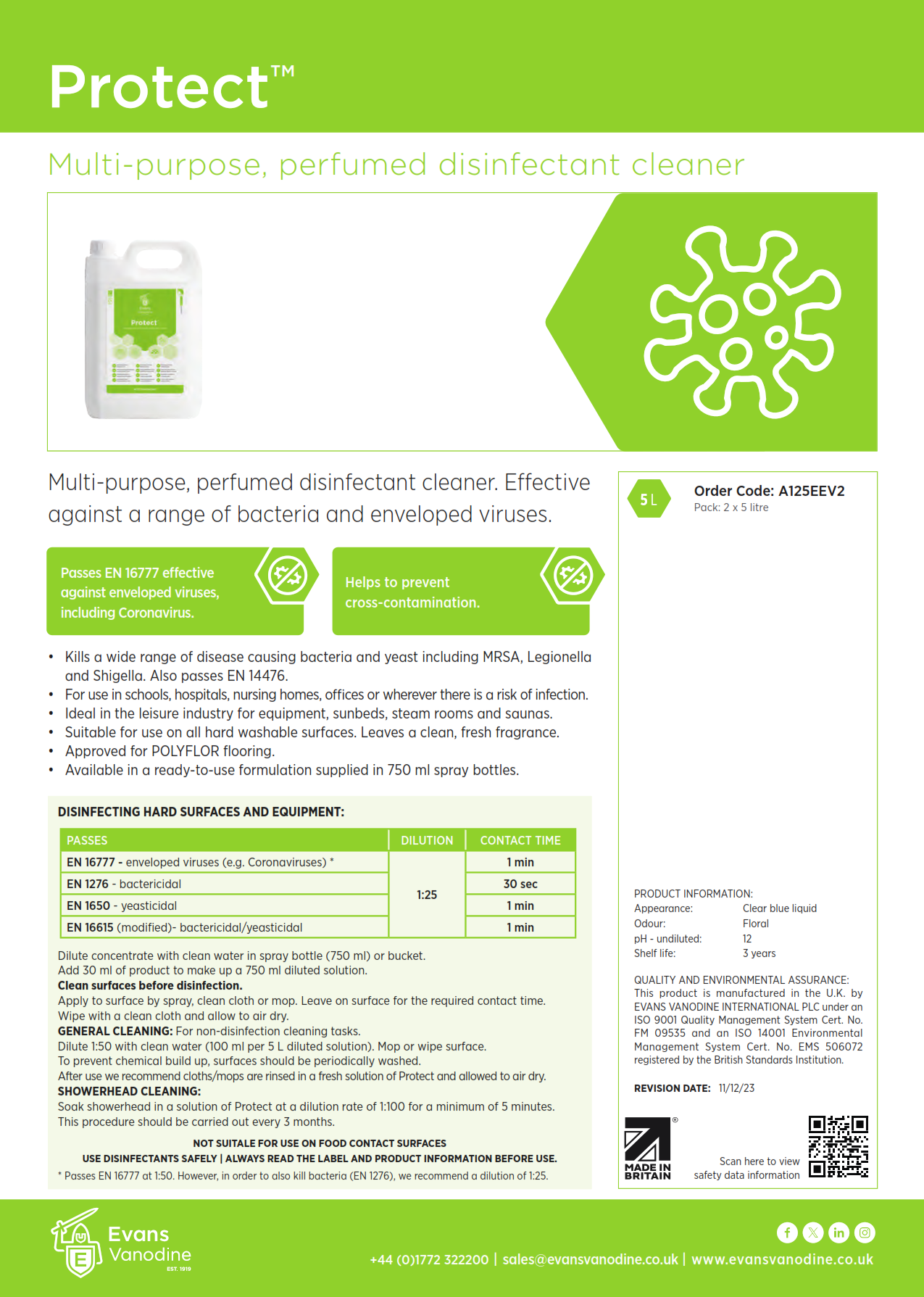 - Passes EN 16777 and EN 14476; effective against enveloped viruses, including Coronavirus.