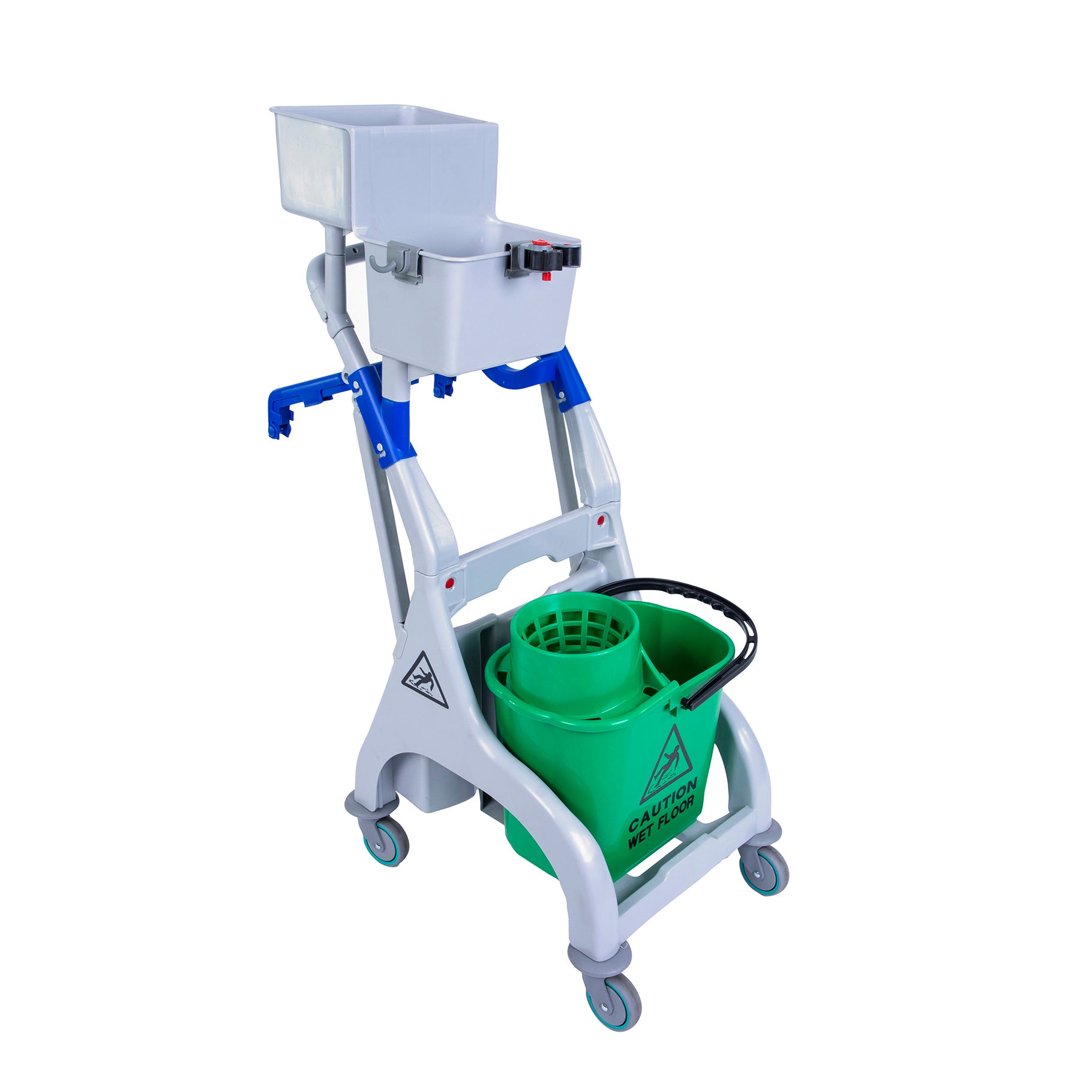 Designed for the socket mopping of smaller floor areas. The trolley includes a colour coded 15 litre bucket and wringer, a roller clip to hold a mop, two bucket holders, two hooks to hold equipment, a handle holder, a rear holder for refuse sacks, and a shelf at the back to hold equipment. Buckets and containers are colour coded.