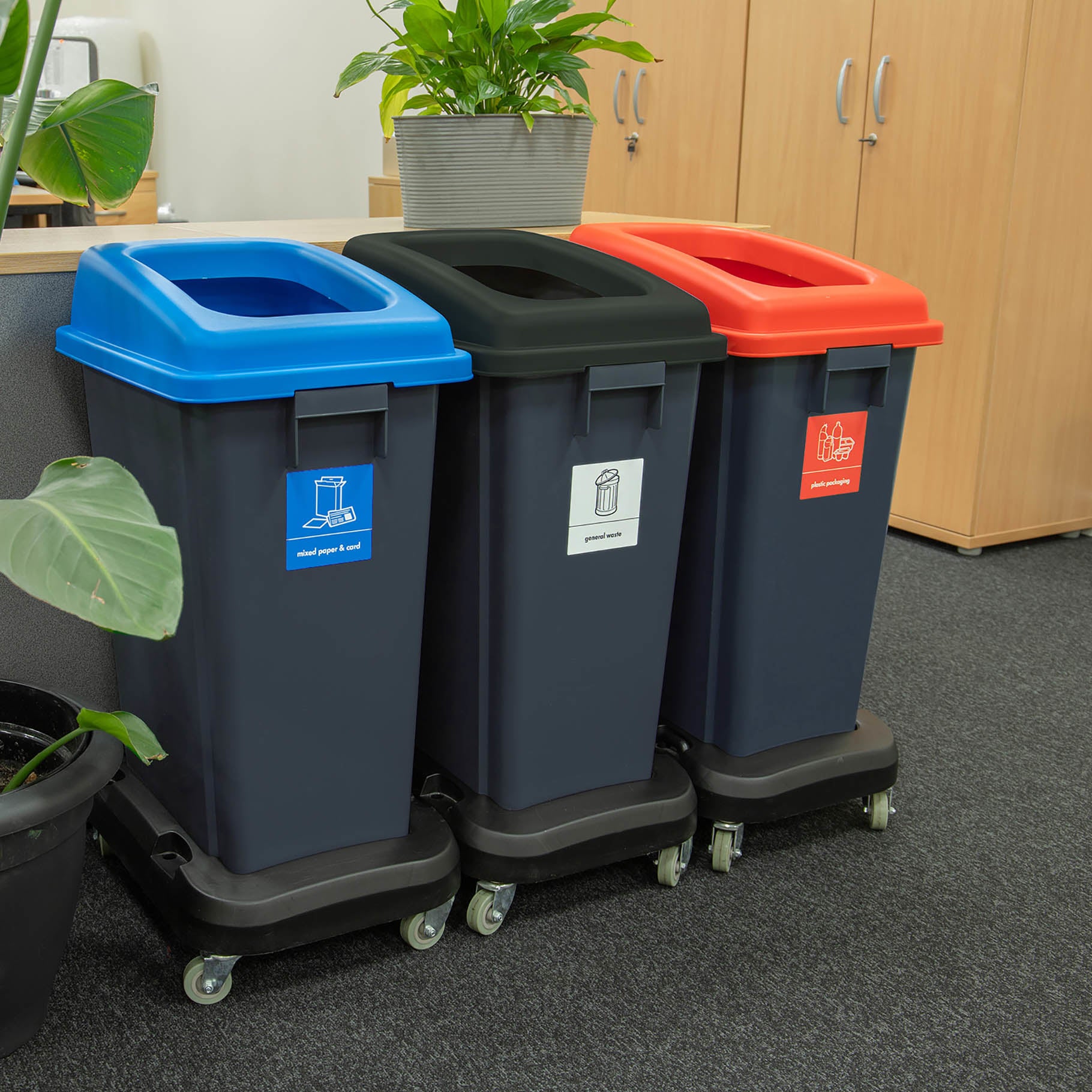 A lightweight, easy clean 60 litre recycling bin made from 100% recycled plastic and with handles on either side. Use with colour coded Open Lids for waste management, the bins can be used alone or linked as a set with the Buddy Bin Wheeled Base. Recycling stickers are also available.