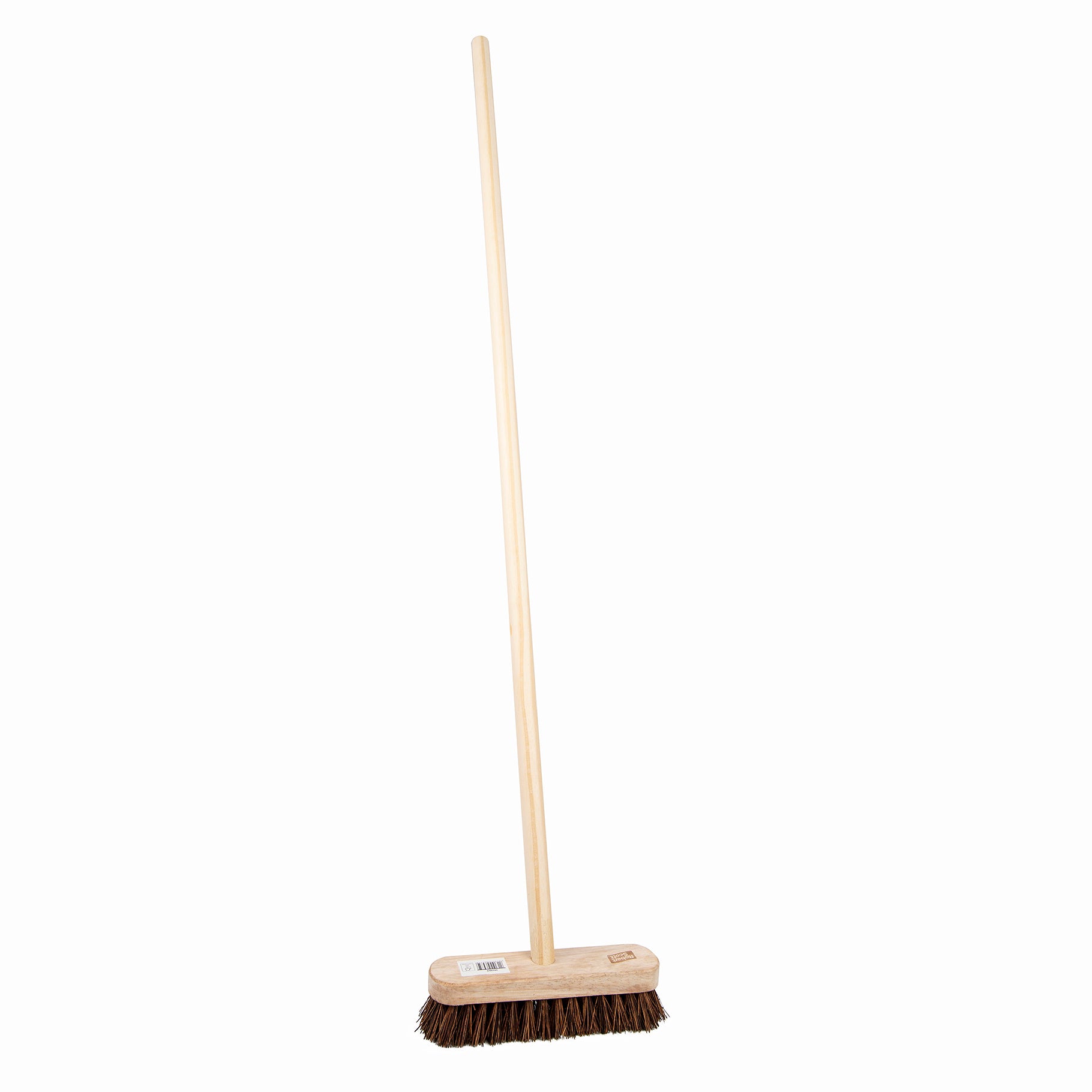 Wooden deck scrub head with stiff bassine bristles and 47" handle for tough scrubbing tasks.